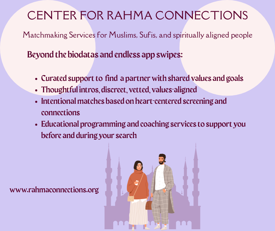 The Center for Rahma Connections is one my side projects. I'm obsessed with love and after experiencing the toxicity of dating apps, I have helped build a platform for matchmaking singles look for aligned and spiritually-attuned partners. You can become a member for six-months, with the opportunity to receive introductions with potential matches one at a time. Rahma Connections will soon offer coaching support for individuals throughout the process, from help discerning what they are looking for in a partner and walking through the courtship process. We will also soon offer educational and coaching support calls.
